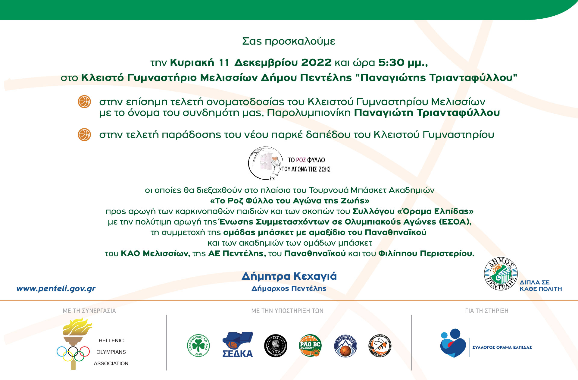 Ένα ακόμη έργο παραδίδεται από τη Δήμαρχο Δήμητρα Κεχαγιά στην αθλητική οικογένεια του Δήμου Πεντέλης. Το νέο παρκέ δάπεδο στο Κλειστό Γυμναστήριο Μελισσίων του Δήμου μας που φέρει το όνομα του συνδημότη μας, Παραολυμπιονίκη Παναγιώτη Τριανταφύλλου, παραδίδεται κι επίσημα στις ομάδες της πόλης μας, την Κυριακή 11 Δεκεμβρίου 2022 (ώρα προσέλευσης 5:30 μ.μ.).