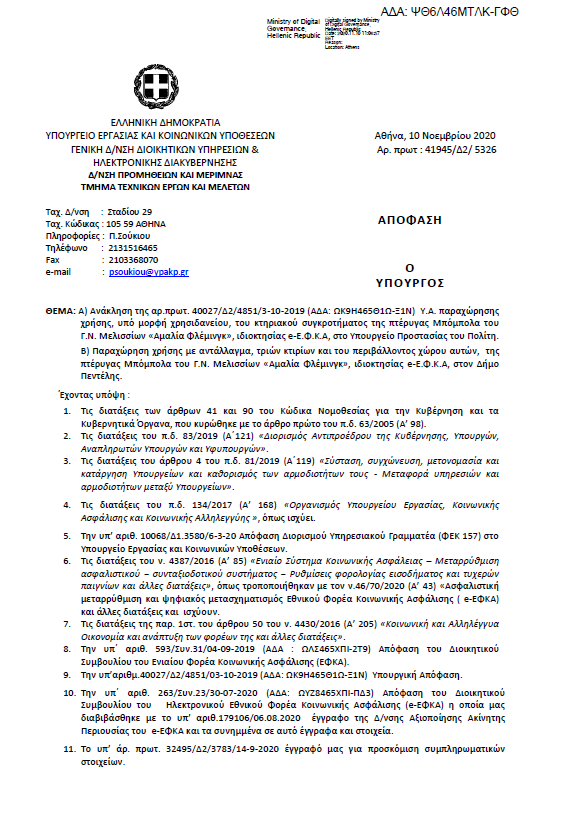 Εκδόθηκε από τον Υπουργό Εργασίας και Κοινωνικών Υποθέσεων κ. Γιάννη Βρούτση η απόφαση παραχώρησης τριών κτηρίων και του περιβάλλοντος χώρου της πτέρυγας Μπόμπολα προς το Δήμο Πεντέλης.