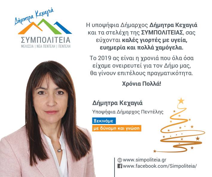 Η Υποψήφια Δήμαρχος Πεντέλης Δήμητρα Κεχαγιά και τα στελέχη της Συμπολιτείας εύχονται Καλές Γιορτές με υγεία, ευημερία και πολλά χαμόγελα.