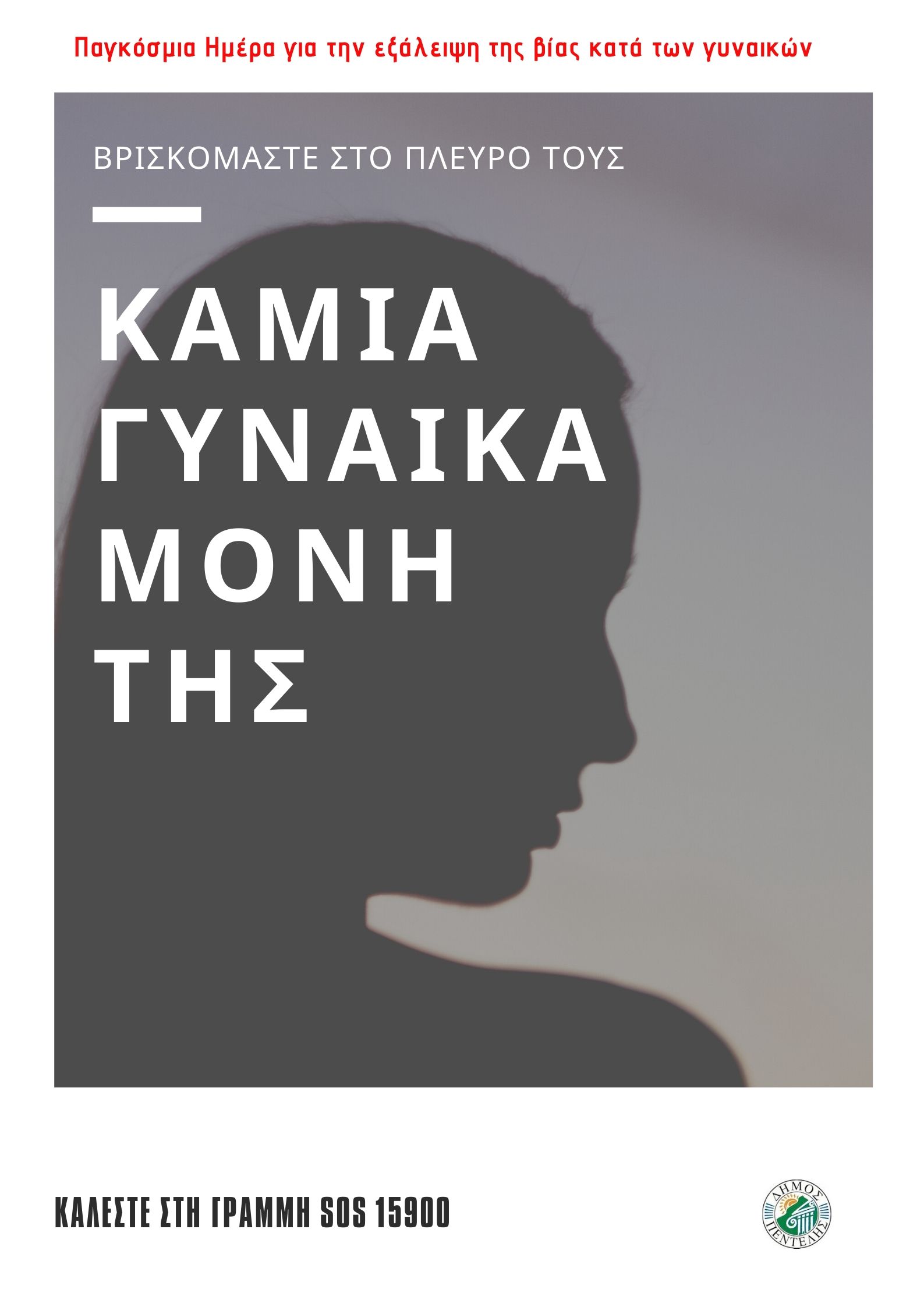 “Μην μένουμε αμέτοχοι απέναντι στη βία. Στηρίζουμε τις γυναίκες που έχουν πέσει θύματα κακοποίησης. Προτρέπουμε την καταγγελία περιστατικών βίας εναντίων γυναικών, στη γραμμή SOS 15900, της Γενικής Γραμματείας Οικογενειακής Πολιτικής και Ισότητας των Φύλων. Καμία δεν πρέπει να το αντιμετωπίσει μόνη της το φαινόμενο της κακοποίησης και της βίας”.