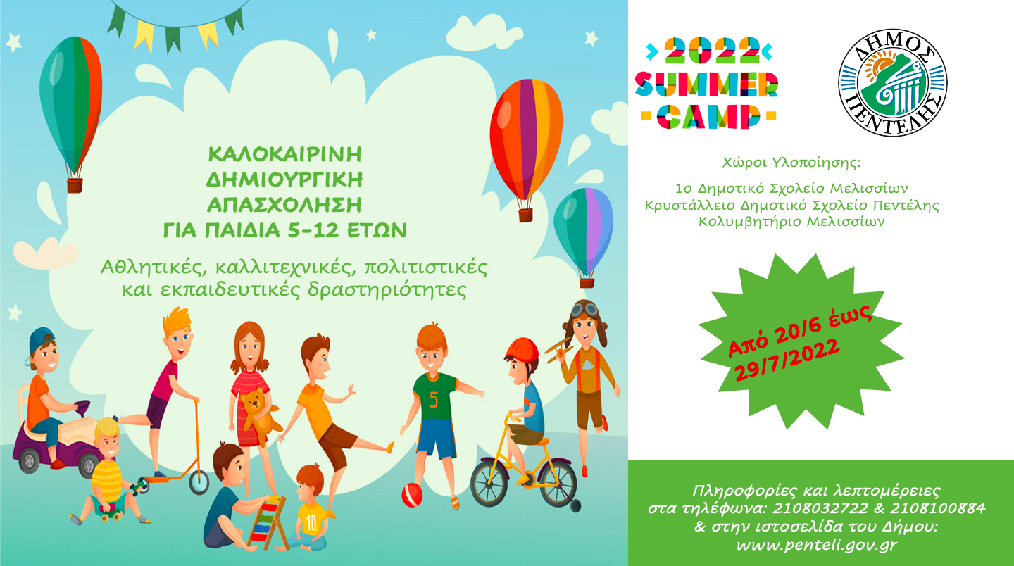 Ο Δήμος Πεντέλης ενημερώνει ότι ξεκινά από την προσεχή Δευτέρα 20/6 το πρόγραμμα καλοκαιρινής δημιουργικής απασχόλησης παιδιών ηλικίας από 5 έως 12 ετών, το οποίο θα διαρκέσει έως και την Παρασκευή 29/7.