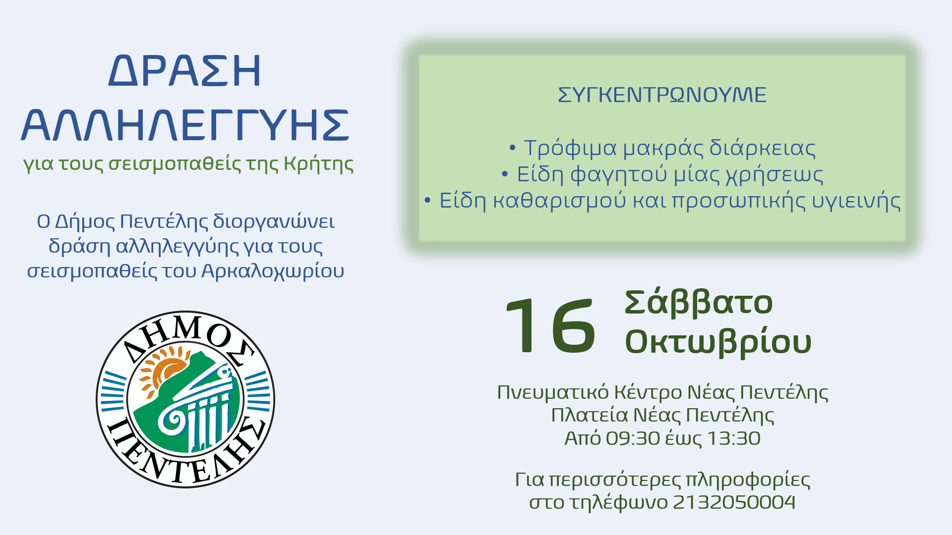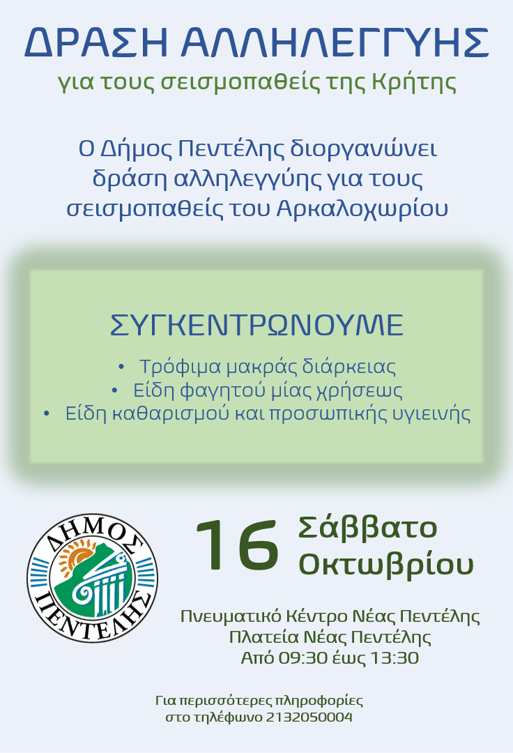 Ο Δήμος Πεντέλης, με σκοπό τη στήριξη των πληγέντων συμπολιτών μας από τους πρόσφατους σεισμούς στην Κρήτη και ειδικότερα στο Αρκαλοχώρι Μινώα Πεδιάδος, διοργανώνει Δράση Αλληλεγγύης για τη συγκέντρωση ειδών πρώτης ανάγκης το Σάββατο 16 Οκτωβρίου και ώρες 09:30 – 13:30 στο Πνευματικό Κέντρο στην Πλατεία Νέας Πεντέλης.