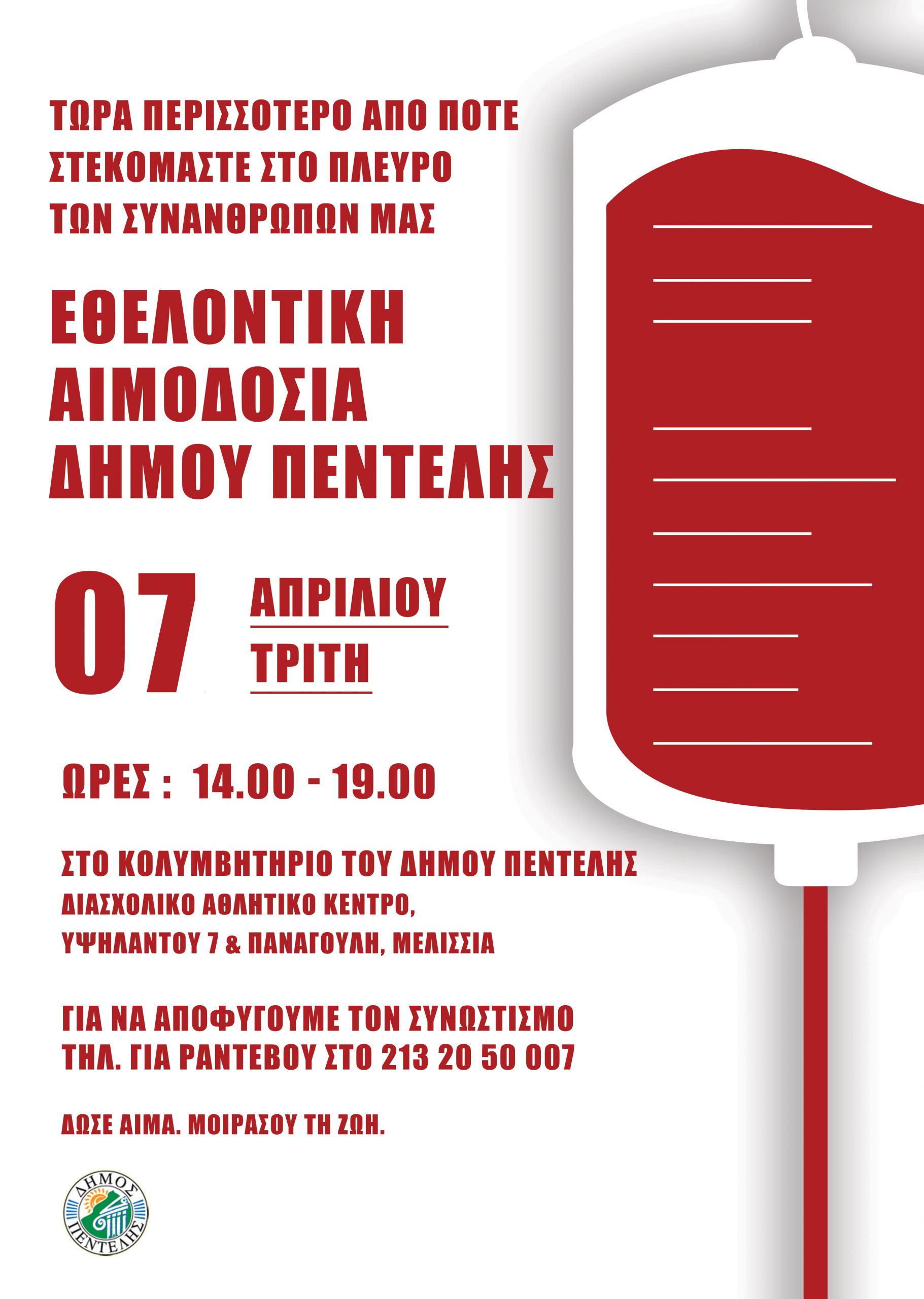 Διοργανώνει δεύτερη ημέρα Εθελοντικής Αιμοδοσίας η οποία θα πραγματοποιηθεί σε ειδικά διαμορφωμένο χώρο στο Κολυμβητήριο του Δήμου Πεντέλης (Διασχολικό Αθλητικό Κέντρο, Υψηλάντου 7 & Παναγούλη, Μελίσσια) την Τρίτη 7 Απριλίου 2020 κατά τις ώρες 14:00-19:00.