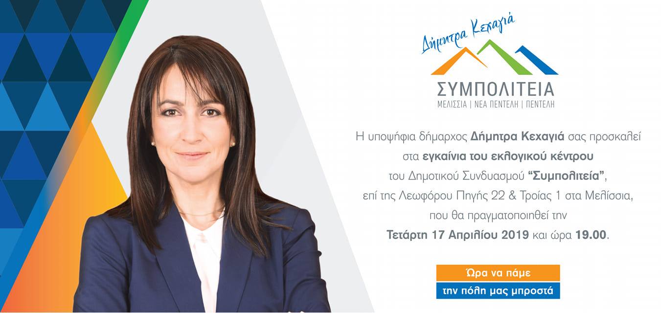 Η Υποψήφια Δήμαρχος Δήμητρα Κεχαγιά σας προσκαλεί στα εγκαίνια του εκλογικού κέντρου του Δημοτικού Συνδυασμού ΣΥΜΠΟΛΙΤΕΙΑ επί της Λεωφόρου Πηγής 22 & Τροίας 1 στα Μελίσσια που θα πραγματοποιηθούν την Τετάρτη 17 Απριλίου και ώρα 19:00.