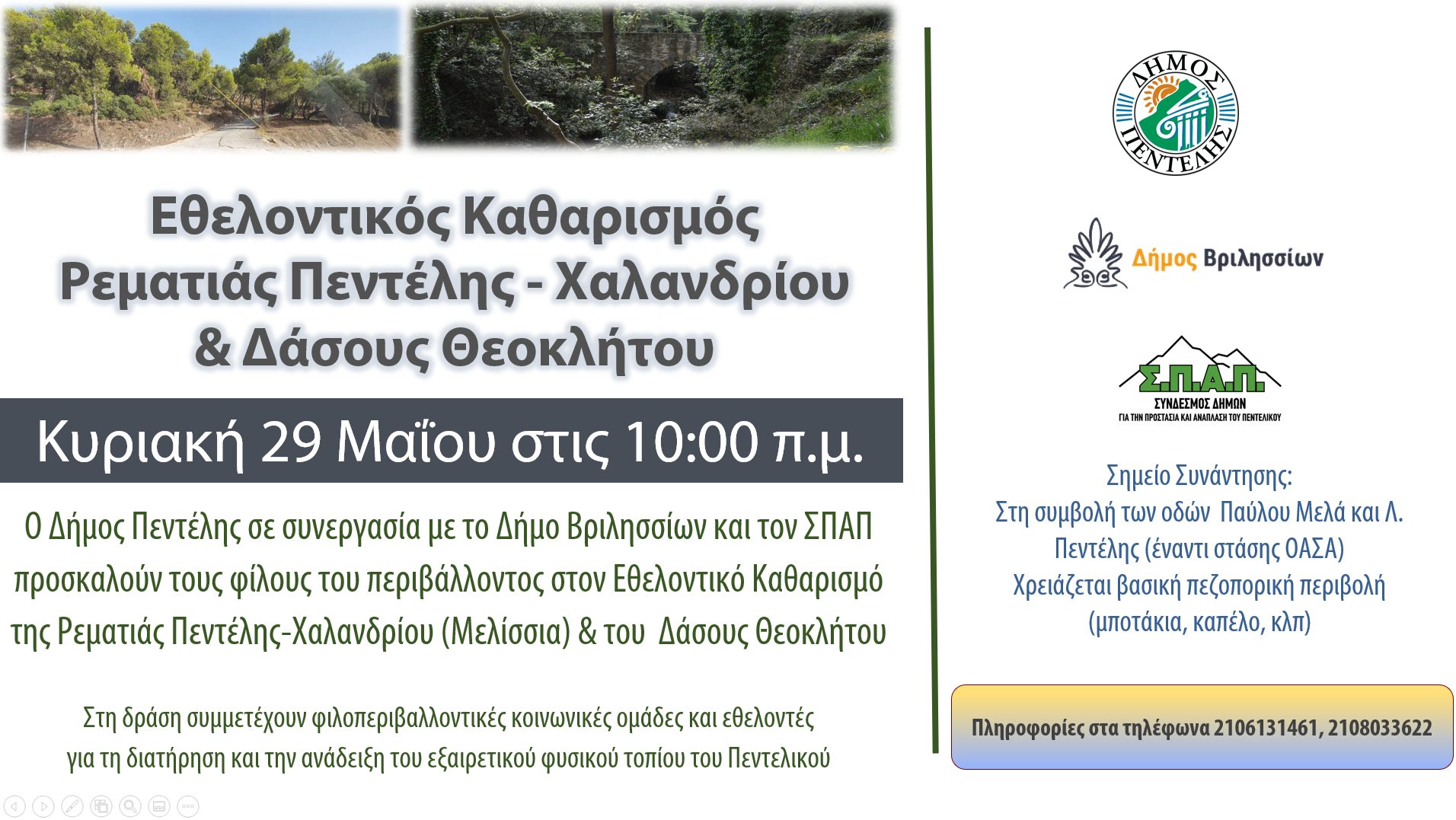 O Δήμος Πεντέλης σε συνεργασία με το Δήμο Βριλησσίων και τον Σύνδεσμο Προστασίας και Ανάπλασης του Πεντελικού (Σ.Π.Α.Π), πραγματοποιούν εθελοντικό καθαρισμό της Ρεματιάς Πεντέλης – Χαλανδρίου (Μελίσσια) και του Δάσους Θεοκλήτου (Βριλήσσια) την Κυριακή 29 Μαΐου και ώρα 10 π.μ.