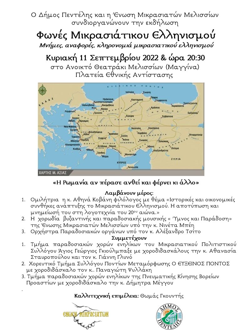 Στο πλαίσιο των επετειακών εκδηλώσεων του Δήμου Πεντέλης για τα 100 χρόνια από την Μικρασιατική καταστροφή, την Κυριακή 11 Σεπτεμβρίου 2022 και ώρα 20:30, στο Ανοικτό Θεατράκι Μελισσίων (Πλατεία Εθνικής Αντίστασης), διοργανώνει σε συνεργασία με το σωματείο Ένωση Μικρασιατών Μελισσίων την εκδήλωση «Φωνές Μικρασιατικού Ελληνισμού – Μνήμες, αναφορές, κληρονομιά Μικρασιατικού Ελληνισμού».