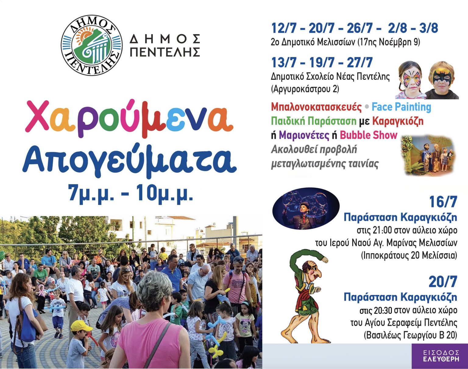 Ένα νέο κύκλο καλοκαιρινών εκδηλώσεων, αποκλειστικά για παιδιά, ξεκινά σήμερα ο Δήμος Πεντέλης. Ουσιαστικά πρόκειται για ένα νέο θεσμό που φιλοδοξεί να καθιερώσει ο δήμος με τη διενέργεια ευχάριστων εκδηλώσεων που απευθύνονται στα παιδιά της πόλης που θα γίνεται μέσα στις γειτονιές της. Οι εκδηλώσεις παρέχονται δωρεάν.