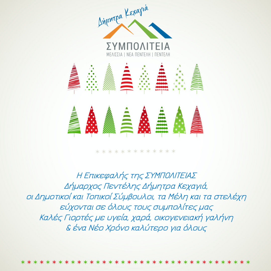 Η Επικεφαλής της ΣΥΜΠΟΛΙΤΕΙΑΣ Δήμαρχος Πεντέλης Δήμητρα Κεχαγιά, οι Δημοτικοί και Τοπικοί Σύμβουλοι, τα Μέλη και τα στελέχη εύχονται σε όλους τους συμπολίτες μας Καλές Γιορτές με υγεία, χαρά, οικογενειακή γαλήνη & ένα καλύτερο Νέο Χρόνο