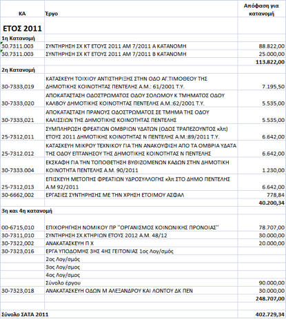 Με τις υπ. αρ. 237/2011, 305/201 και 11/2012 αποφάσεις του Δημοτικού Συμβουλίου, έγινε η κατανομή της ΣΑΤΑ έτους 2011, συνολικού ποσού 402.934 ευρώ στα κάτωθι έργα: