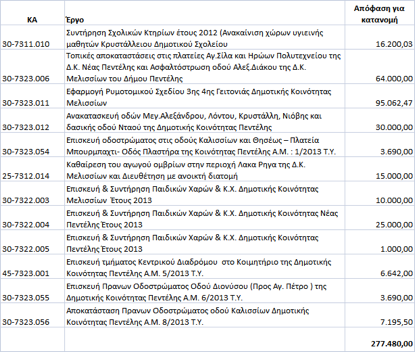 Με την υπ. αρ. 57/2013 απόφαση του Δημοτικού Συμβουλίου έγινε η κατανομή της ΣΑΤΑ έτους 2012, συνολικού ποσού 277.480 ευρώ στα κάτωθι έργα: