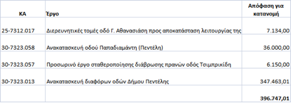 Με τις υπ. 87/2013 και 169/2013 αποφάσεις του Δημοτικού Συμβουλίου, έγινε η κατανομή της ΣΑΤΑ έτους 2013, (1ης – 5ης δόσης, συνολικού ποσού 109.130 ευρώ), και ανακατανομή υπολοίπων 2011 και 2012, στα κάτωθι έργα: