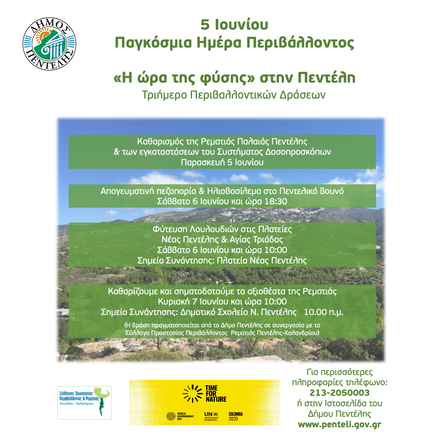 Ο Δήμος Πεντέλης και ο Σύλλογος Προστασίας Περιβάλλοντος και Ρεματιάς Πεντέλης-Χαλανδρίου με στόχο την ανάδειξη της Φύσης στην πόλη μας διοργανώνουν εθελοντική δράση αφιερωμένη στην Παγκόσμια Ημέρα Περιβάλλοντος «Καθαρίζουμε και σηματοδοτούμε τα αξιοθέατα της Ρεματιάς μας»
