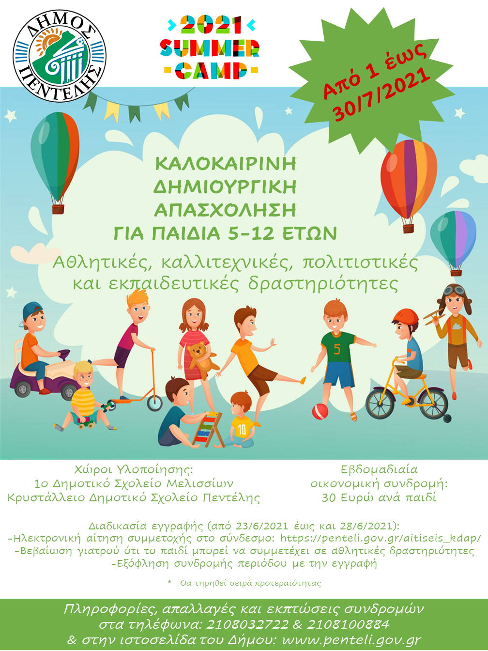 Ο Δήμος Πεντέλης ενημερώνει ότι θα υλοποιήσει πρόγραμμα καλοκαιρινής δημιουργικής απασχόλησης παιδιών ηλικίας από 5 έως 12 ετών, από Πέμπτη 1/7/2021 μέχρι Παρασκευή 30/7/2021 καθημερινά, τις ώρες από 08:00 έως 16:00.