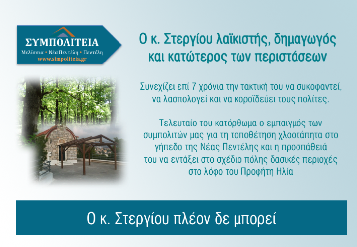 Απαντώντας στο δημοσίευμα μας σχετικά με την αδειοδότηση εργασιών μικρής κλίμακας , στο γήπεδο της Νέας Πεντέλης, στην περιοχή του Προφήτου Ηλία – συνεχίζει με την τακτική που εδώ και 7 χρόνια τον διακρίνει αφ’ ενός να συκοφαντεί και να λασπολογεί τους αντιπάλους του και αφετέρου να συνεχίζει να κοροϊδεύει τους συμπολίτες μας στη Νέα Πεντέλη αντί να ακουμπήσει σωστά στο πρόβλημα.