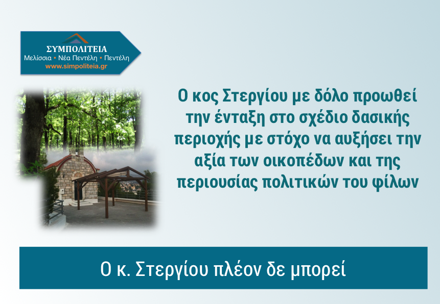 Τέλος, στους διοικούντες την ομάδα ποδοσφαίρου του Νεοπεντελικού, ένα έχουμε να τους πούμε. Ανοίξτε τα μάτια σας. Ο κ. Στεργίου σας κοροϊδεύει και θα συνεχίσει να το κάνει όσο εσείς δεν είστε καλά ενημερωμένοι για τα θέματα. Με την ισχύουσα νομοθεσία, το γήπεδο μπορεί να προχωρήσει. Δεν χρειάζονται οι ανοησίες που κάνει ο κ. Στεργίου, που όπως αναλύσαμε, στοχεύουν να αυξήσουν την περιουσία των πολιτικών του φίλων στην περιοχή.