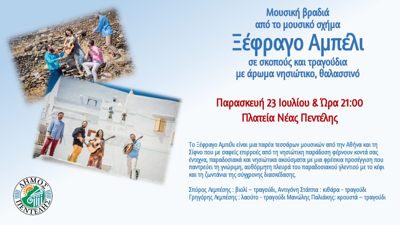 Ο Δήμος Πεντέλης διοργανώνει Μουσική Βραδιά από το μουσικό σχήμα «Ξέφραγο Αμπέλι», την Παρασκευή 23 Ιουλίου και ώρα 9 μ.μ. στην Πλατεία της Νέας Πεντέλης.