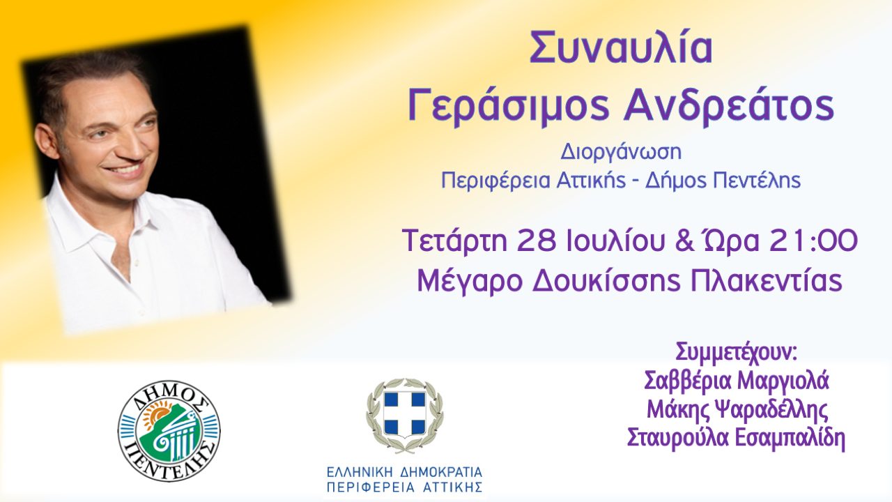 Ο Δήμος Πεντέλης συνδιοργανώνει με την Περιφέρεια Αττικής Μουσική Συναυλία με τον Γεράσιμο Ανδρεάτο, την Τετάρτη 28 Ιουλίου και ώρα 9 μ.μ. στο Μέγαρο Δουκίσσης Πλακεντίας.
