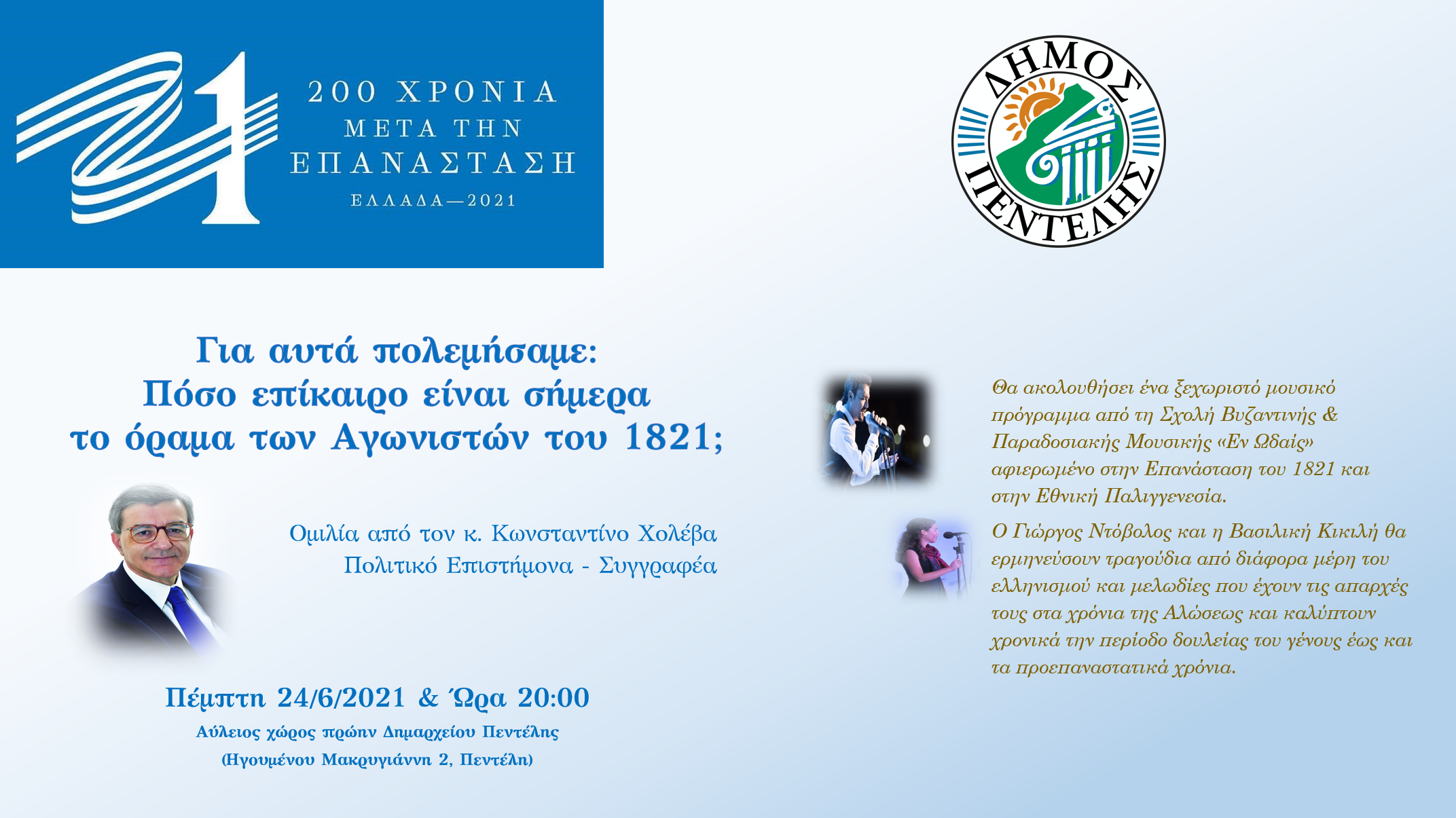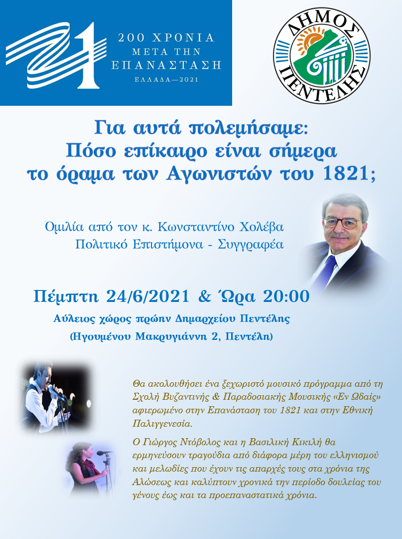 Ξεκινούν οι Πολιτιστικές Εκδηλώσεις του Δήμου Πεντέλης, που είναι αφιερωμένες στον εορτασμό των 200 χρόνων (1821-2021) από την Επανάσταση και την Εθνική Παλιγγενεσία.