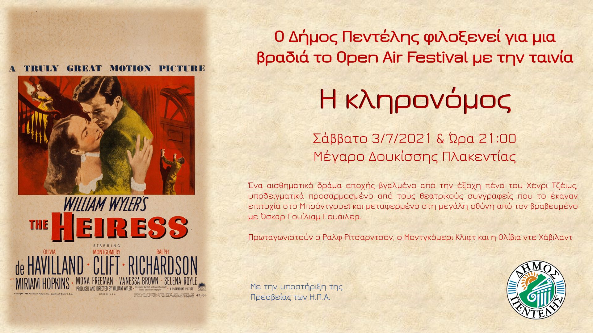 Ο Δήμος Πεντέλης φιλοξενεί για μια βραδιά το Open Air Festival με την προβολή της ταινίας “Η κληρονόμος”, το Σάββατο 3/7/2021 & Ώρα 21:00, στο Μέγαρο Δουκίσσης Πλακεντίας