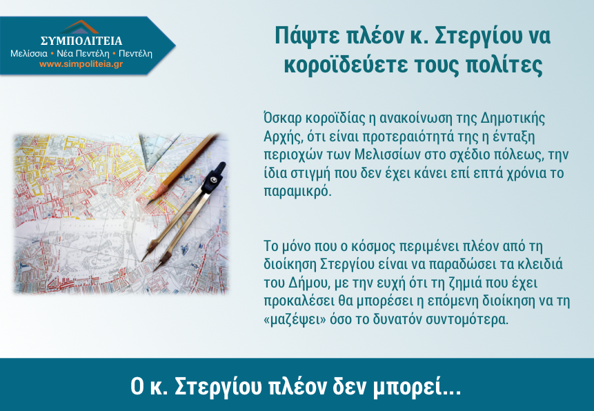 Μετά από 7 χρόνια στη διοίκηση, ο κ. Στεργίου κάνει ακόμη ενέργειες, για ένα θέμα που ο ίδιος θεωρεί προτεραιότητα, αλλά αποτέλεσμα δεν έρχεται. Η μειωμένη ικανότητά του ν’ αντιληφθεί το βάθος και τη σοβαρότητα των πολεοδομικών θεμάτων είναι η αιτία που η διοίκησή του δεν έχει καταφέρει να δώσει λύση σε κανένα από τα πολεοδομικά θέματα που απασχολούν τις τρεις Δημοτικές Ενότητες. Το Γενικό Πολεοδομικό Σχέδιο Πεντέλης, η ένταξη της περιοχής της 25ης Μαρτίου της Νέας Πεντέλης στο Σχέδιο πόλης, η αναθεώρηση του Σχεδίου Πόλης των Μελισσίων, είναι μερικά παραδείγματα που επιβεβαιώνουν την ανικανότητα της δημοτικής αρχής.