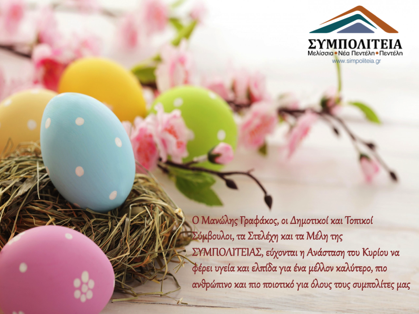 Ο Μανώλης Γραφάκος, οι Δημοτικοί και Τοπικοί Σύμβουλοι, τα Στελέχη και τα Μέλη της ΣΥΜΠΟΛΙΤΕΙΑΣ, εύχονται η Ανάσταση του Κυρίου να φέρει υγεία και ελπίδα για ένα μέλλον καλύτερο, πιο ανθρώπινο και πιο ποιοτικό για όλους τους συμπολίτες μας