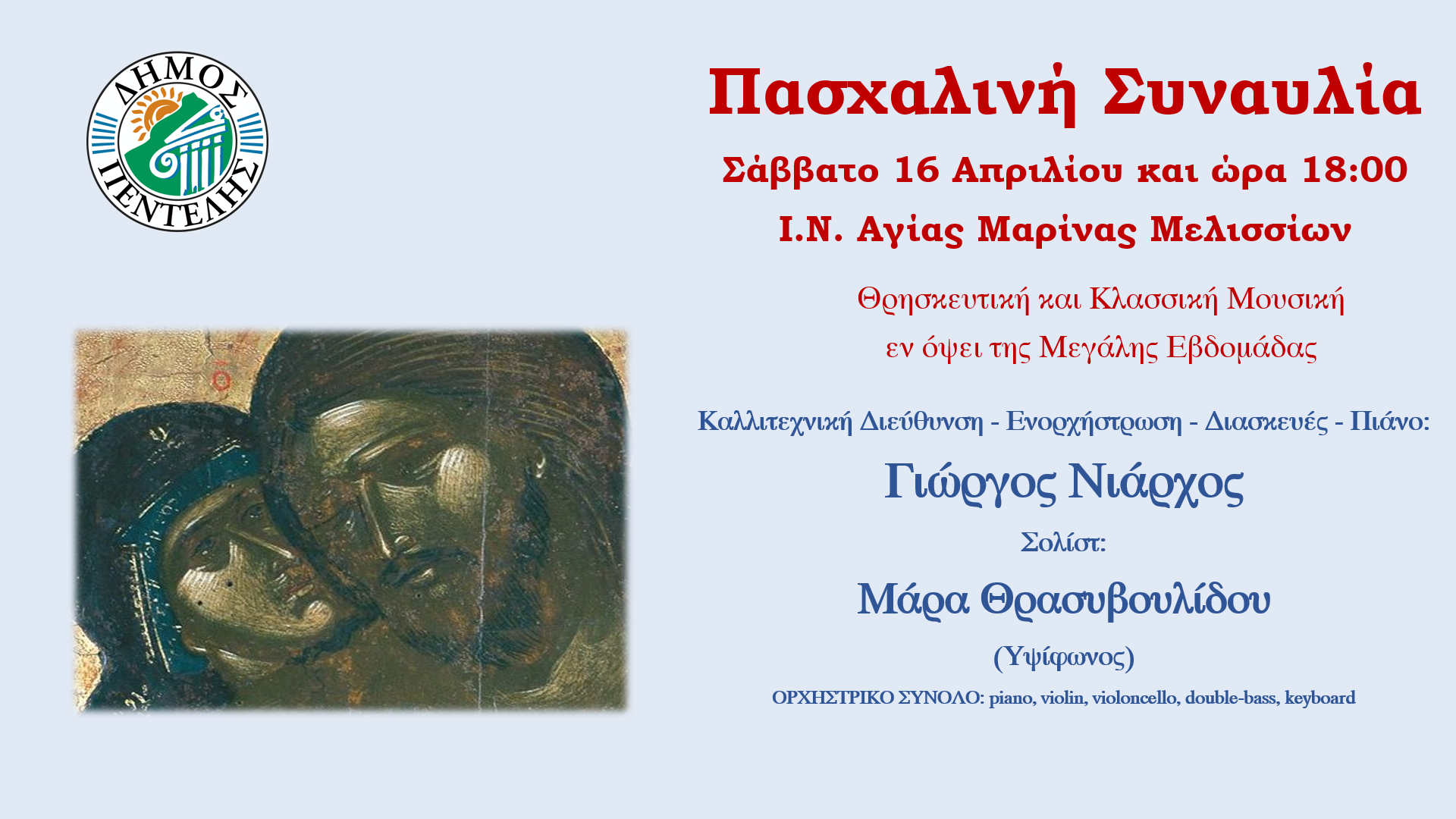 Ο Δήμος Πεντέλης διοργανώνει εν όψει της Μεγάλης Εβδομάδας Συναυλία με Θρησκευτική και Κλασική μουσική το Σάββατο 16 Απριλίου Σάββατο και ώρα 6 μ.μ. στον Ιερό Ναό Αγίας Μαρίνας Μελισσίων.