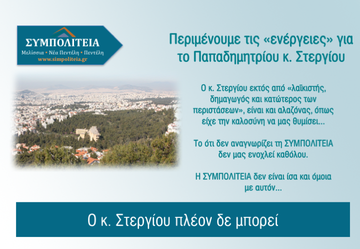 Στην υποβολή του ερωτήματος της ΣΥΜΠΟΛΙΤΕΙΑΣ με το οποίο ζητούνται οι ενέργειες της Δημοτικής Αρχής για το Δάσος Παπαδημητρίου, ο κ. Στεργίου αντί να απαντήσει επί της ουσίας του του ερωτήματος, απάντησε ότι «… έχουν ακολουθηθεί όλες οι απαραίτητες ενέργειες για τον καθορισμό τιμής μονάδος αποζημίωσης και αναμένεται η σχετική δικαστική απόφαση».