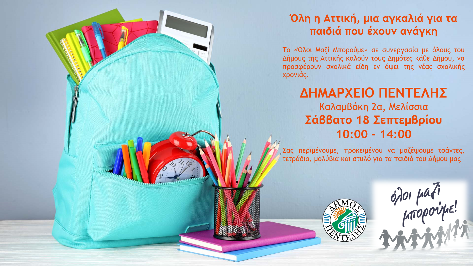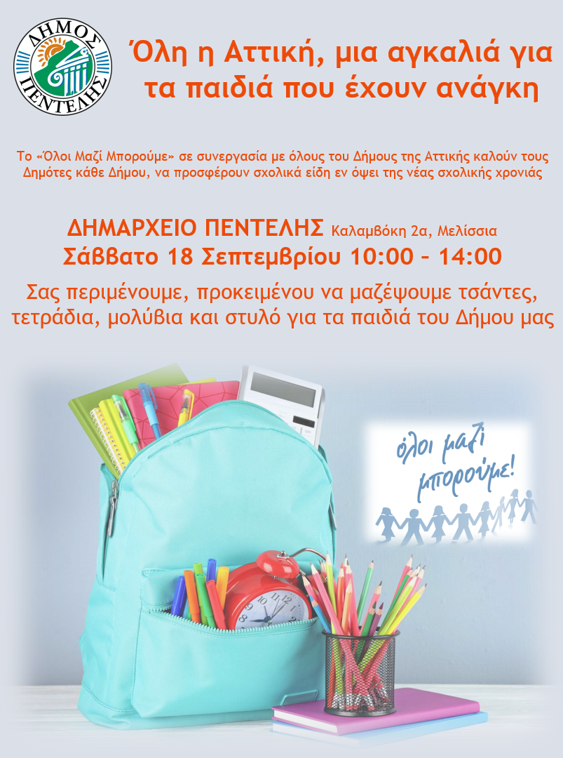 Το Σάββατο 18 Σεπτεμβρίου, από τις 10:00 – 14:00, σας περιμένουμε στο Δημαρχείο Πεντέλης (Καλαμβόκη 2α Μελίσσια), προκειμένου να μαζέψουμε τσάντες, τετράδια, μολύβια και στυλό για τα παιδιά του Δήμου μας.