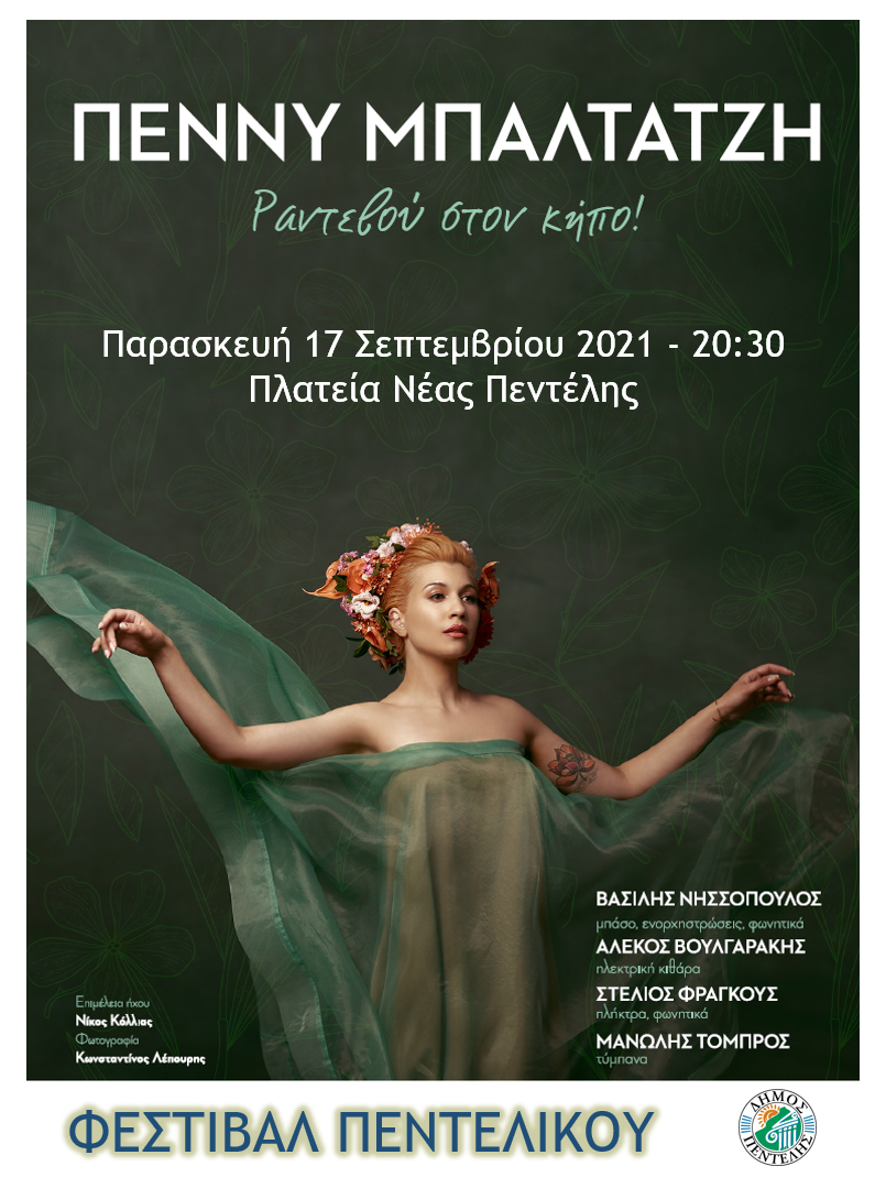 Στο πλαίσιο του Φεστιβάλ Πεντελικού η γνωστή ερμηνεύτρια Πέννυ Μπαλτατζή με τη δημιουργική έμπνευση που πάντα τη χαρακτηρίζει μοιράζεται μαζί μας αγαπημένα τραγούδια δικά της, αλλά και άλλων μουσικών δημιουργών , προσκαλώντας μας να τραγουδήσουμε, να χορέψουμε, να αισθανθούμε, να απογειωθούμε μαζί της.