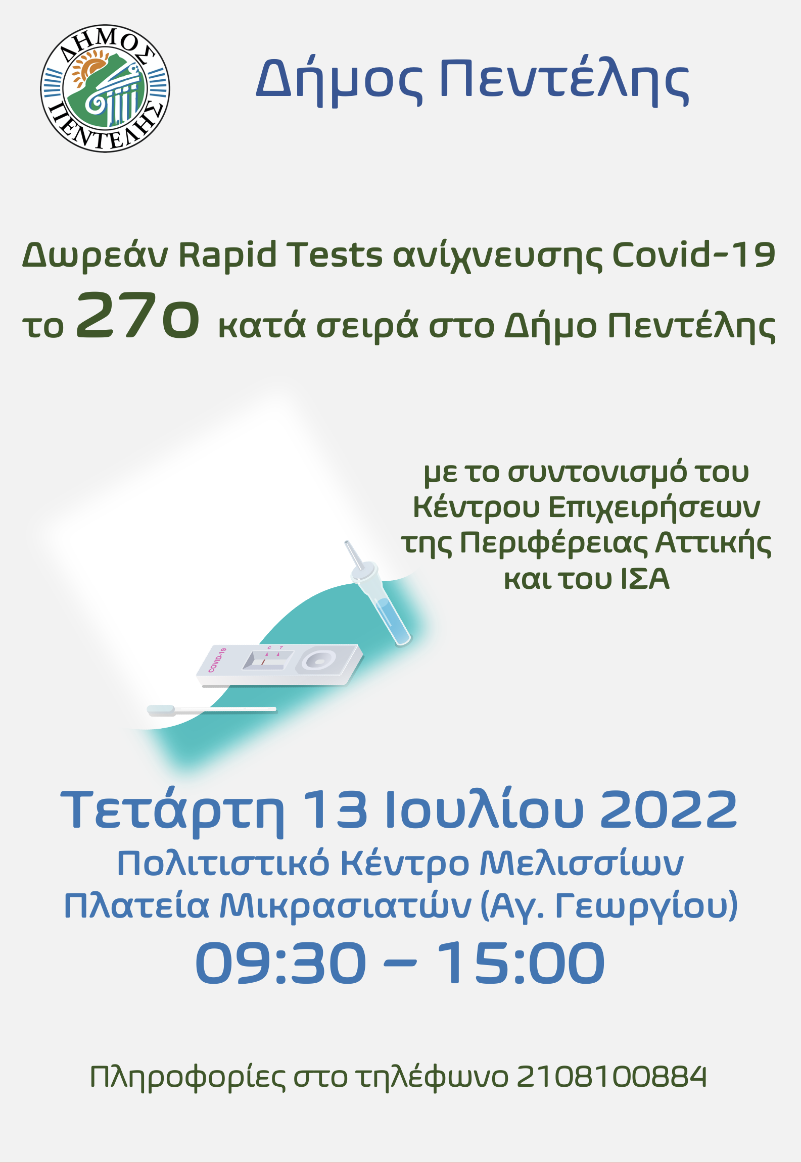 Στο πλαίσιο αυτό διενεργεί δωρεάν δειγματοληπτικό έλεγχο ανίχνευσης κρουσμάτων Covid-19 (Rapid Test), για κατοίκους και εργαζομένους του Δήμου, το 27ο κατά σειρά, την Τετάρτη 13 Ιουλίου 2022 στο Πολιτιστικό Κέντρο Μελισσίων από 09:30 έως 15:00.