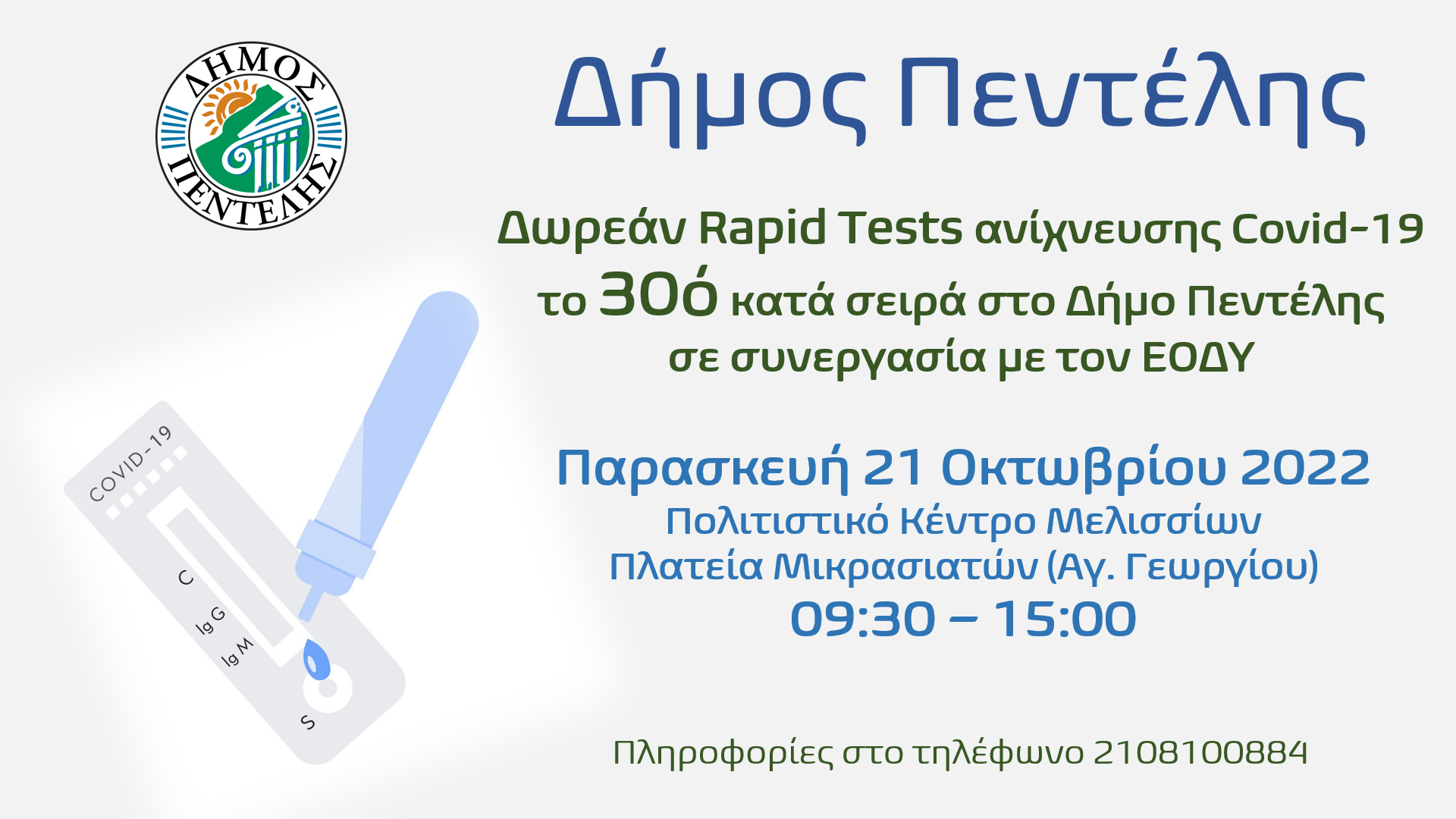 Στο πλαίσιο αυτό διενεργεί δωρεάν δειγματοληπτικό έλεγχο ανίχνευσης κρουσμάτων Covid-19 (Rapid Test), τον 30ό κατά σειρά, την Παρασκευή 21 Οκτωβρίου στο Πολιτιστικό Κέντρο Μελισσίων, (Πλατεία Μικρασιατών) Αγίου Γεωργίου από 09:30 έως 15:00.