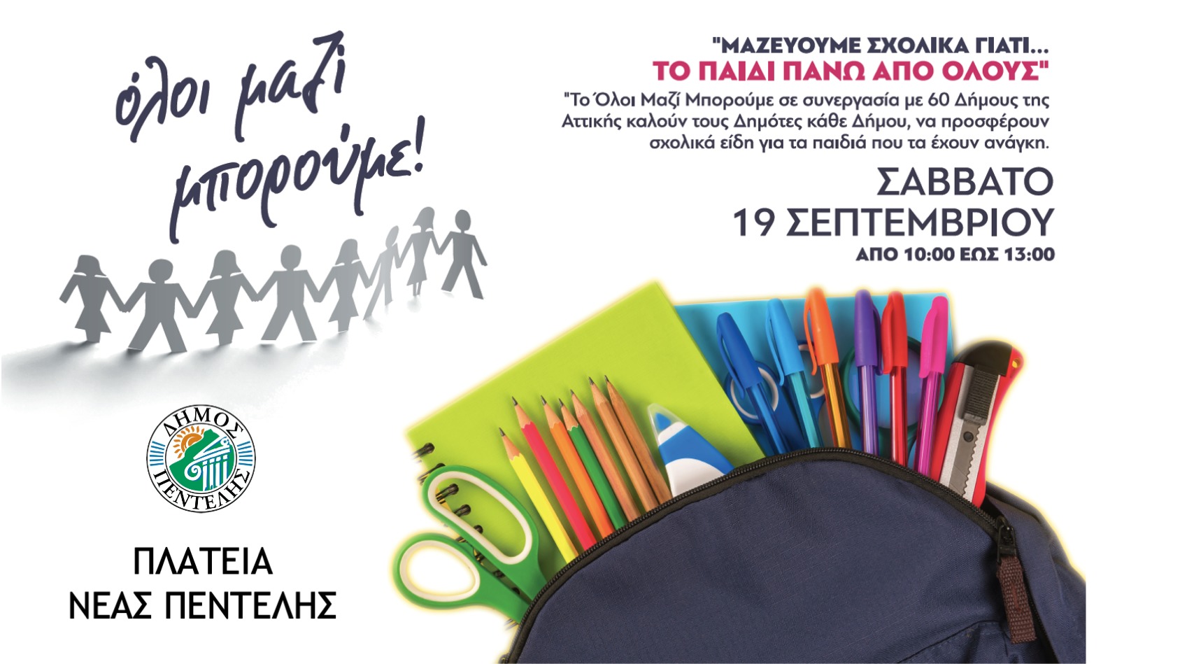 Ο Δήμος Πεντέλης συμμετέχει στην δράση του Όλοι Μαζί Μπορούμε “Μαζεύουμε Σχολικά γιατί… Το παιδί πάνω απ’ όλoυς!”.