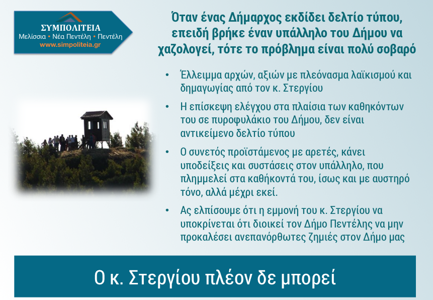 Ας ελπίσουμε ότι η εμμονή του κ. Στεργίου να υποκρίνεται ότι διοικεί τον Δήμο Πεντέλης να μην προκαλέσει ανεπανόρθωτες ζημιές στον Δήμο μας.