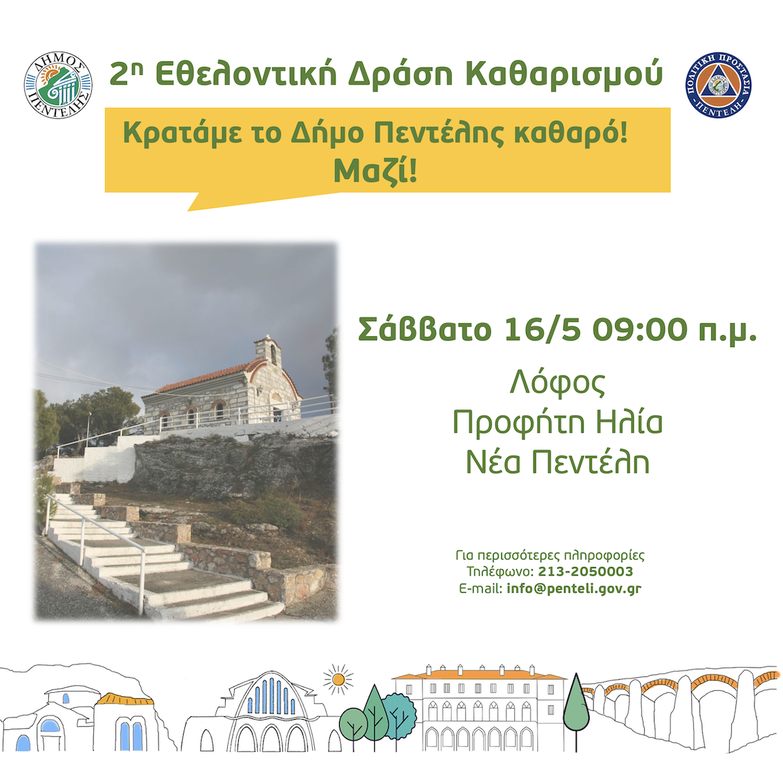 Ο Εθελοντικός Καθαρισμός θα πραγματοποιηθεί στο Λόφο του Προφήτη Ηλία στη Δημοτική Κοινότητα Νέας Πεντέλης, το Σάββατο 16 Μαΐου 2020 στις 09:00 π.μ.