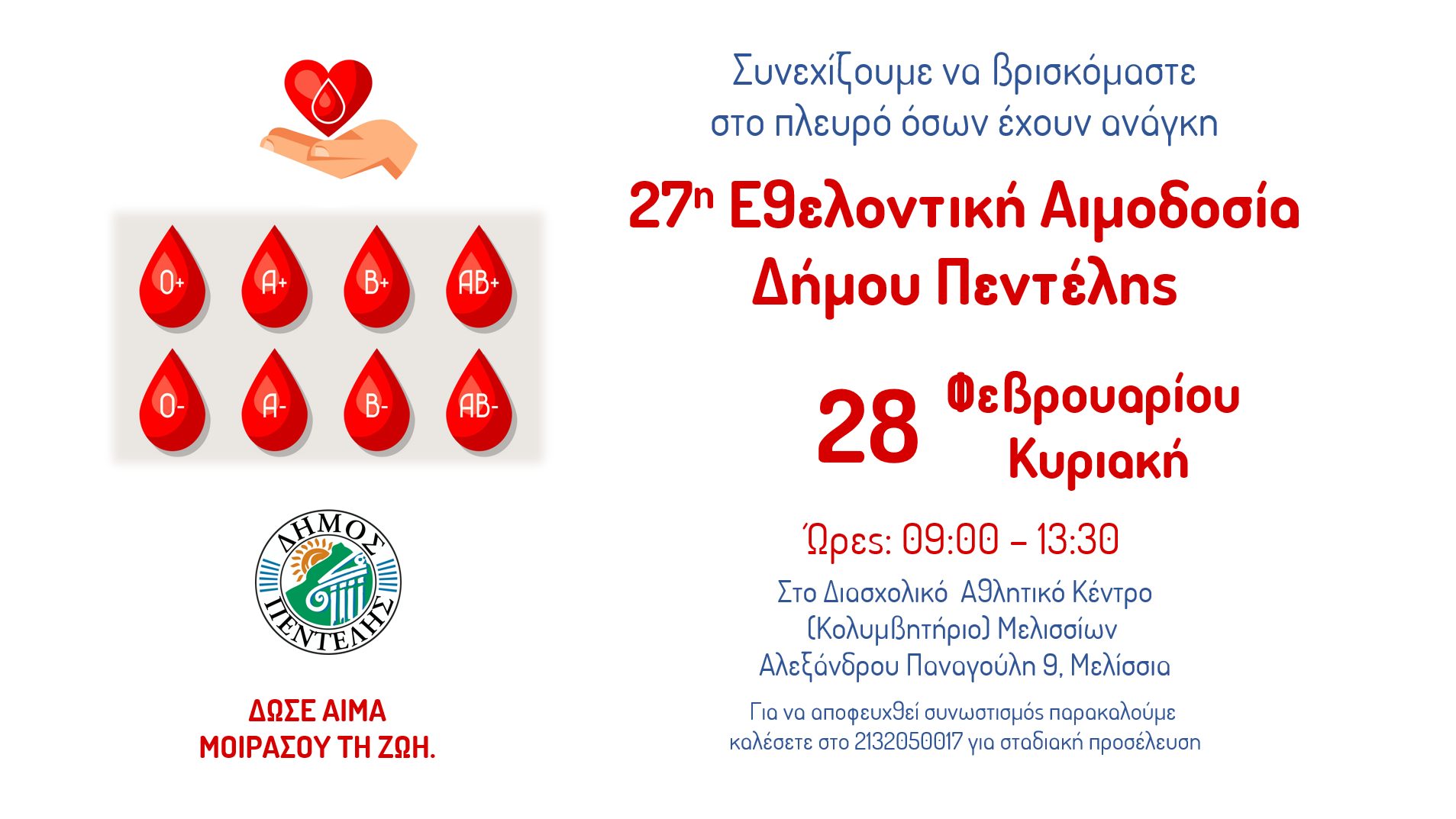 Σας περιμένουμε λοιπόν στην 27η Εθελοντική Αιμοδοσία που θα πραγματοποιηθεί στο Διασχολικό Αθλητικό Κέντρο (Αλ. Παναγούλη 9 Μελίσσια) την Κυριακή 28 Φεβρουαρίου 2020 κατά τις ώρες 9.30-13.30.