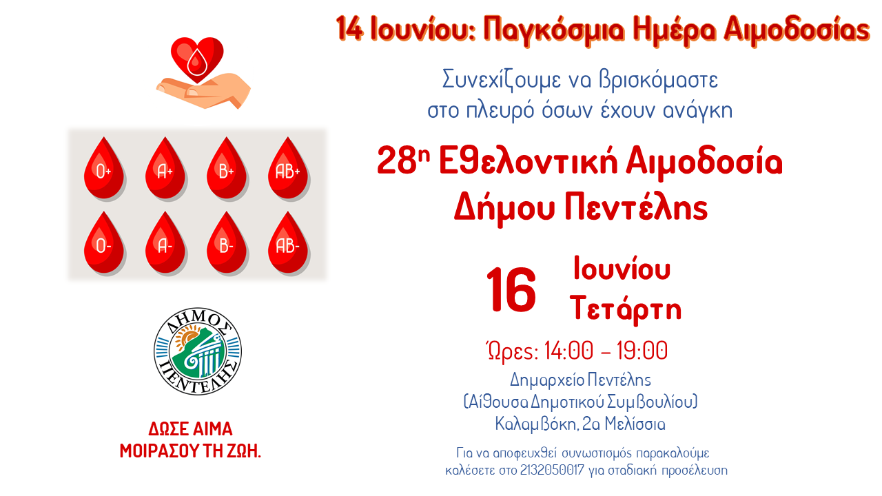 Ο Δήμος Πεντέλης τιμώντας την Παγκόσμια Ημέρα Αιμοδοσίας και μένοντας πιστός στις δεσμεύσεις του και πάντοτε αρωγός των Δημοτών του, τηρώντας το πρόγραμμα κοινωνικής πολιτικής του διοργανώνει ημέρα εθελοντικής αιμοδοσίας για την ενίσχυση της Δημοτικής Τράπεζας Αίματος, ώστε να μπορεί να καλύψει τις ανάγκες σε μονάδες αίματος των εθελοντών αιμοδοτών, κατοίκων και πολιτών του Δήμου μας.