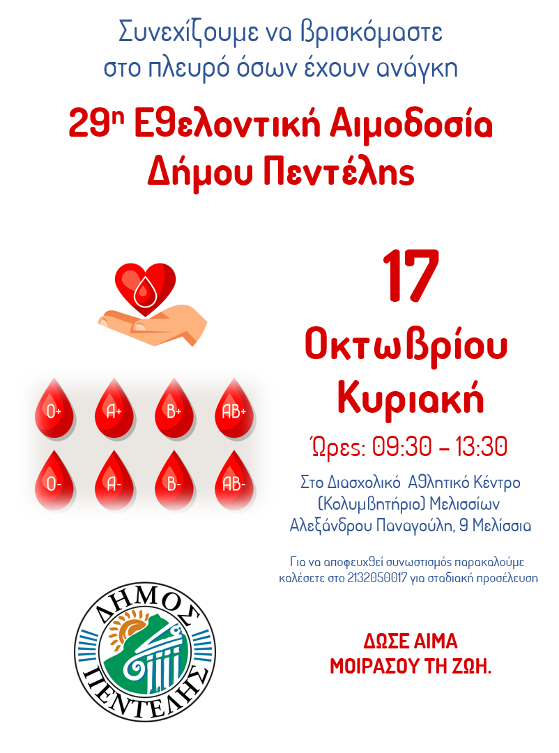 Ο Δήμος Πεντέλης μένοντας πιστός στις δεσμεύσεις του και πάντοτε αρωγός των Δημοτών του, τηρώντας το πρόγραμμα κοινωνικής πολιτικής του διοργανώνει ημέρα εθελοντικής αιμοδοσίας για την ενίσχυση της Δημοτικής Τράπεζας Αίματος, ώστε να μπορεί να καλύψει τις ανάγκες σε μονάδες αίματος των εθελοντών αιμοδοτών, κατοίκων και πολιτών του Δήμου μας.