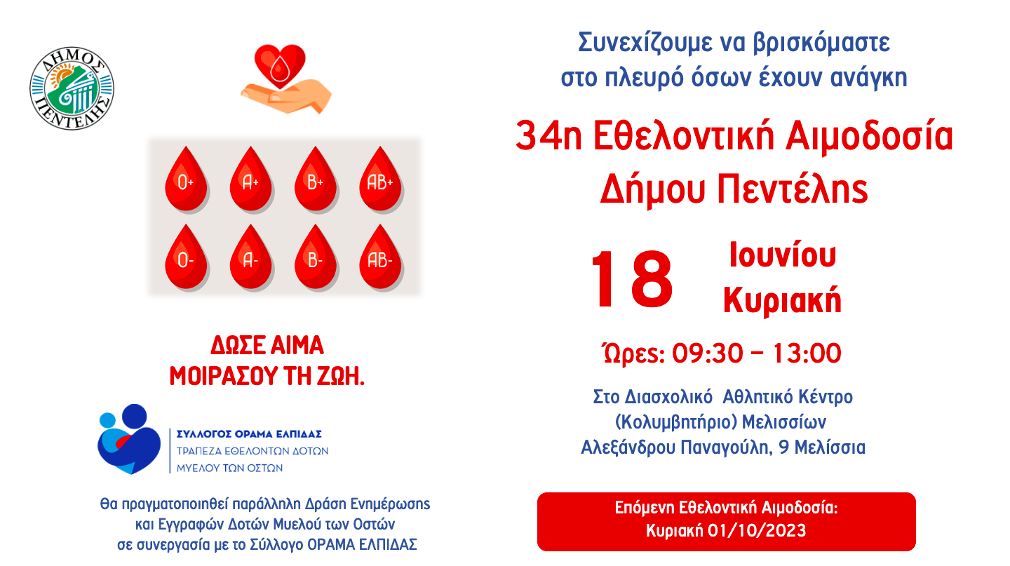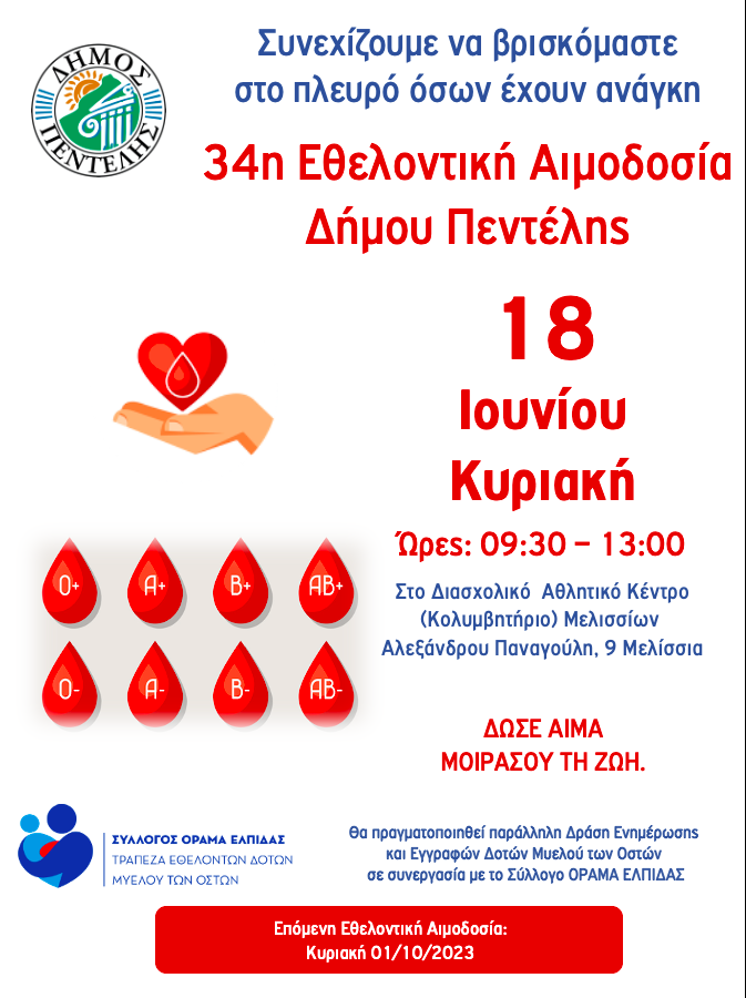Σας περιμένουμε λοιπόν στην 34η Εθελοντική Αιμοδοσία που θα πραγματοποιηθεί την Κυριακή 18 Ιουνίου 2023 στο Διασχολικό Αθλητικό Κέντρο (Αλ. Παναγούλη 9 Μελίσσια) κατά τις ώρες 9.30-13.00.