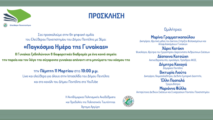 Το Ελεύθερο Πανεπιστήμιο του Δήμου Πεντέλης την Πέμπτη 11 Μαρτίου και ώρα 19:00μμ. σας προσκαλεί σε μια διαδραστική συνομιλία 8 γυναικών με αφορμή την 8η Μαρτίου.