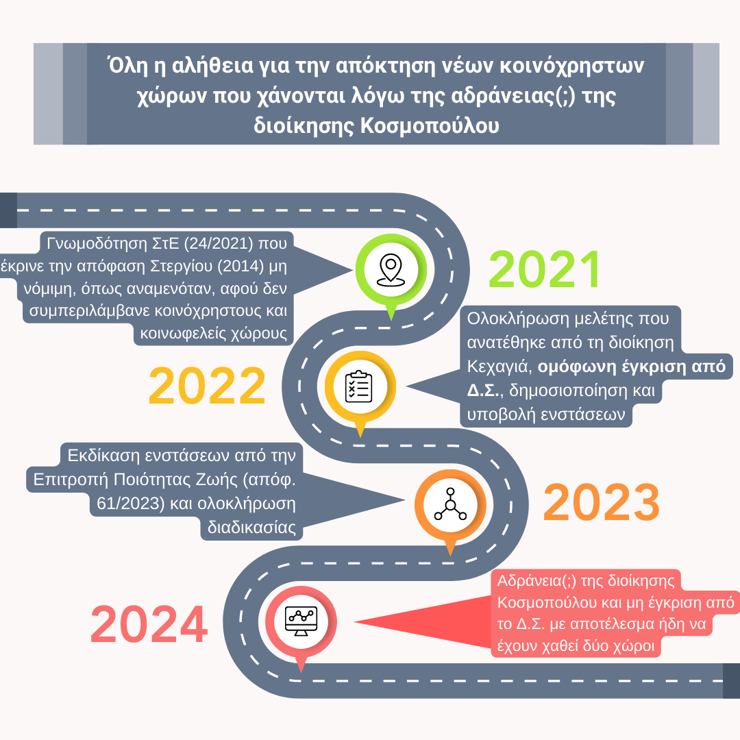 - Το 2021 γνωμοδότηση του Συμβουλίου της Επικρατείας κρίνει ως μη νόμιμη -όπως αναμενόταν- την απόφαση Στεργίου (2014), καθώς δεν συμπεριλάμβανε κοινόχρηστους και κοινωφελείς χώρους.