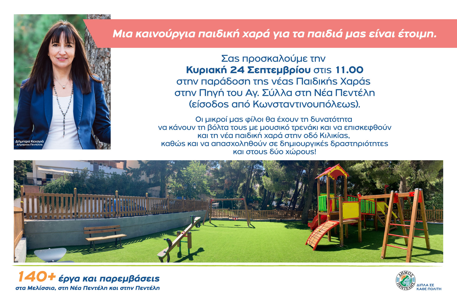 Σας προσκαλούμε την Κυριακή 24, Σεπτεμβρίου στις 11 π.μ. στην παράδοση της νέας Παιδικής Χαράς στην Πηγή του Αγίου Σύλλα στη νέα Πεντέλη (είσοδος από Κωνσταντινουπόλεως).