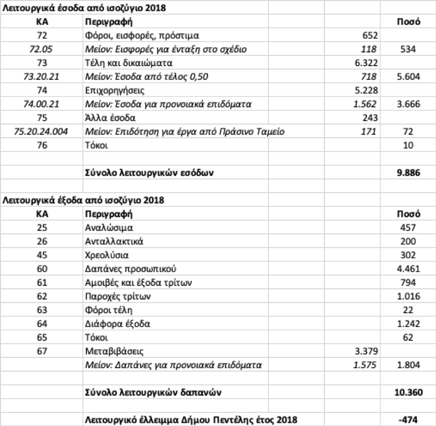 Η Δημοτική Αρχή, τα στοιχεία που δίνει στη δημοσιότητα, είναι από τα επίσημα ισοζύγια του Δήμου και τα στοιχεία από το οριστικό ισοζύγιο του Δήμου το 2018, που πιστοποιούν ότι το λειτουργικό έλλειμμα ήταν 474.000 ευρώ, έχουν ως εξής:
