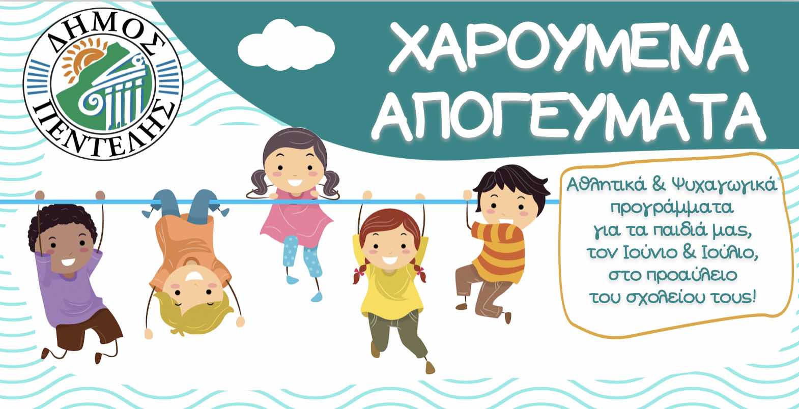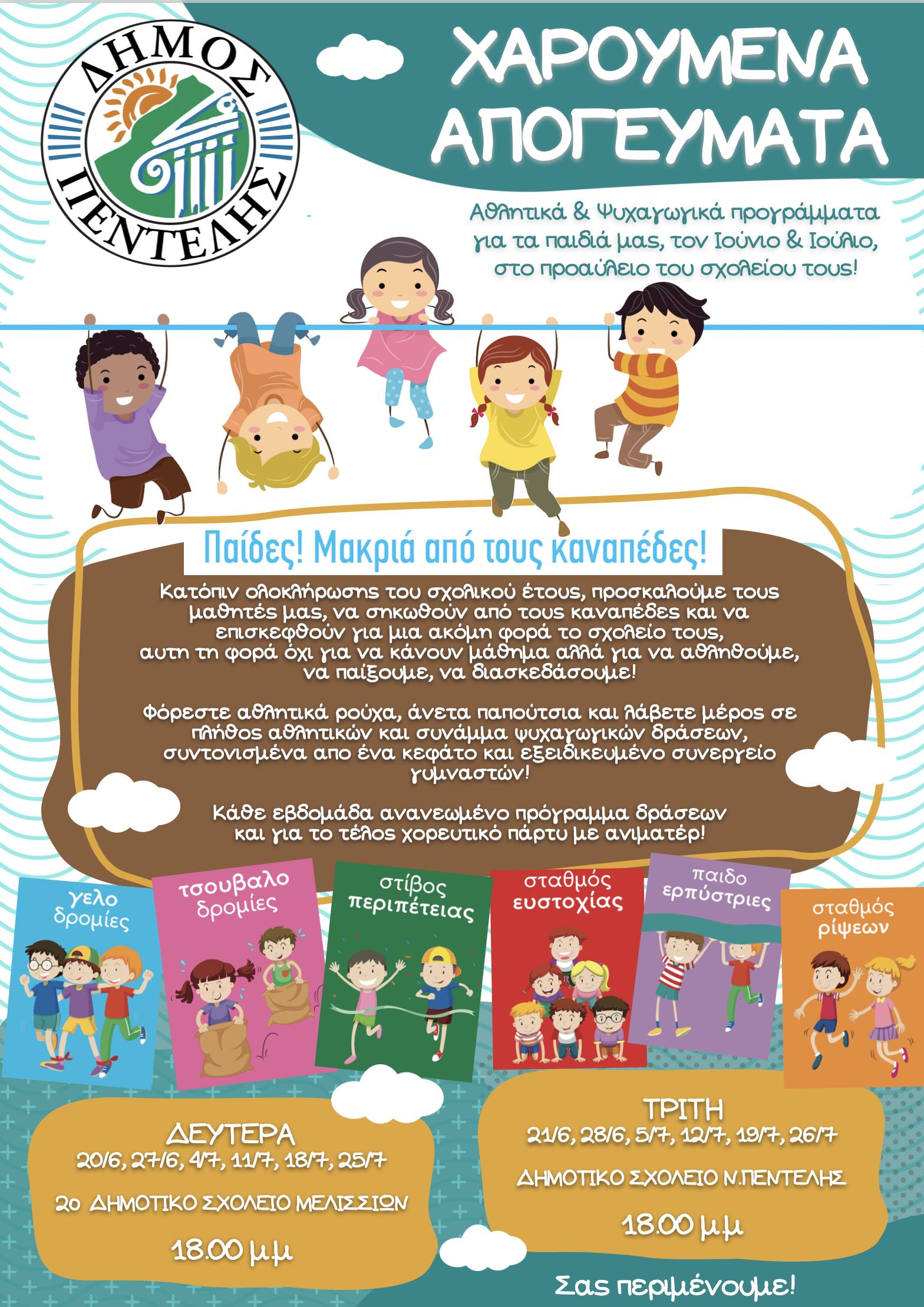 Ο Δήμος Πεντέλης διοργανώνει για δεύτερη συνεχή χρονιά Χαρούμενα Απογεύματα για τους μικρούς μας φίλους, από 20 Ιουνίου έως και 26 Ιουλίου στους γνώριμους χώρους των σχολικών αύλειων χώρων και ώρες από 7 – 10 μ.μ.